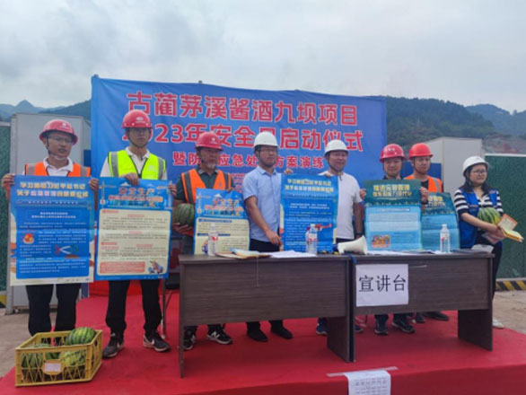 6月8日下午,古藺茅溪醬酒九壩項(xiàng)目施工現(xiàn)場開展2023年安全生產(chǎn)月啟動儀式暨防火應(yīng)急處置方案演練活動,活動共計(jì)100人參與,40人參演,200余人觀摩,活動得到建設(shè)單位的一致肯定,并獲得安全文明施工加分。